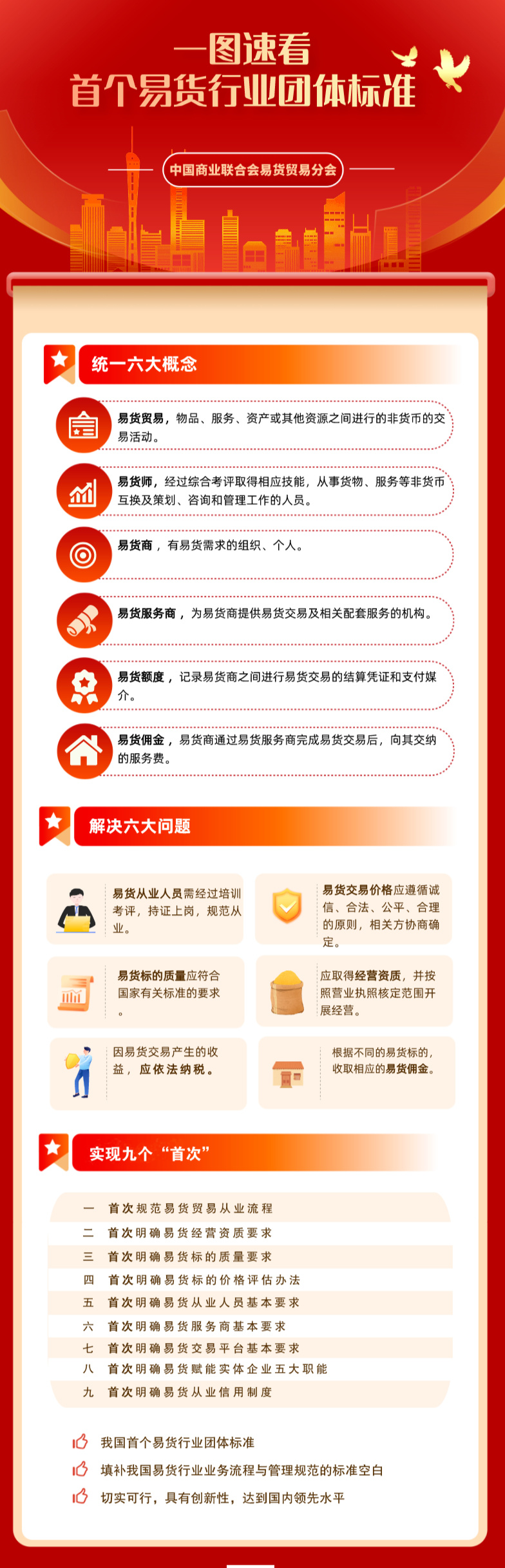 我国首个易货行业团体标准10月1日实施根据国家标准化管理委员会有关规定、中国商业联合会2023年第4号团体标准公告,我国首个易货行业团体标准《易货贸易业务流程与管理基本要求》于2023年10月1日实施,标准编号为T/CGCC84—2023。标准将由***专业出版单位中国标准出版社正式出版。 该标准从征集、立项、起草、征求意见、专家评审、报批审核到发布实施历时两年,在标准编制过程中,河南物桥实业有限公司、济南爱航云网络信息服务有限公司、山东省易货标准化研究院、云南盾元投资管理有限公司、易站绿色科技集团有限公司、中库会(临沂)国际易货交易股份有限公司、辽宁中小企业信用服务有限公司、快易货国际贸易有限公司、融易通(深圳)投资股份有限公司、易货师(济南)职业技能鉴定中心、中易物联(深圳)库存数据管理有限公司、华商丝路易货总会(海南)管理服务有限公司、中警智链(山东)云科技集团股份有限公司、重庆贝宜贝物资有限公司、易物慧商(贵州)数字经济产业集团有限公司、西部易货国际贸易(重庆)有限公司、内蒙古北方科技专修学院等单位积极参与,从人力、物力、财力等方面提供协助与支持。 我国易货领域权威专家一致认为,该标准内容全面,结构清晰,规定明确,结合新版《国家职业分类大典》对易货师新职业的定义和主要工作任务,规定了易货贸易的业务流程,对开展国内易货贸易相关业务提供指导和依据,对促进易货行业规范发展具有重要意义。标准充分结合了新易货发展理念、行业特点和业务实践,规定了易货贸易经营管理的基本要求,包括易货经营资质、易货标的质量、易货交易价格、易货从业人员、易货服务商、客户服务、信用管理七个方面的有关要求,对提升易货贸易服务质量和水平将起到积极的推动作用。 ![]() |