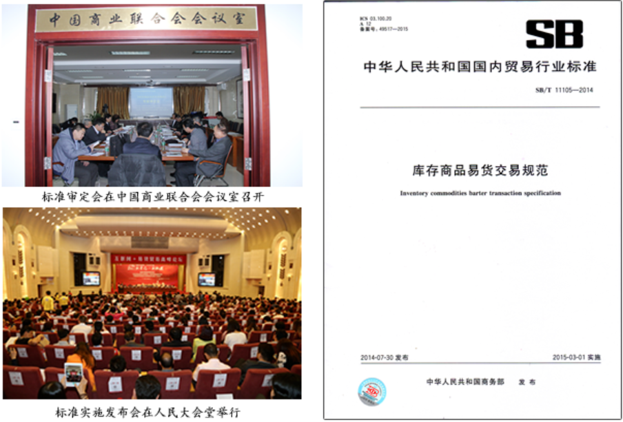 促进新职业的发展,制定相应的行业标准必不可少。2012年,秘书处对《库存商品易货交易规范》行业标准开展相关预研工作。2013年3月13日,向商务部提交了该标准的申报材料,6月25日,根据《商务部办公厅关于下达2013年流通行业标准项目计划的通知》(商办流通函[2013]第621号),《库存商品易货交易规范》行业标准正式立项。经过起草、征求意见、审定、报批等流程,商务部2014年第54号公告批准《库存商品易货交易规范》标准编号为SB/T 11105-2014,实施日期为2015年3月1日。《库存商品易货交易规范》是我国首个易货领域的行业标准,确立了易货行业的合法地位,为易货交易活动提供了参考依据。标准规定了库存商品易货交易活动中涉及的术语与定义、基本原则、库存商品的要求、易货交易参与方、易货交易业务程序的要求。