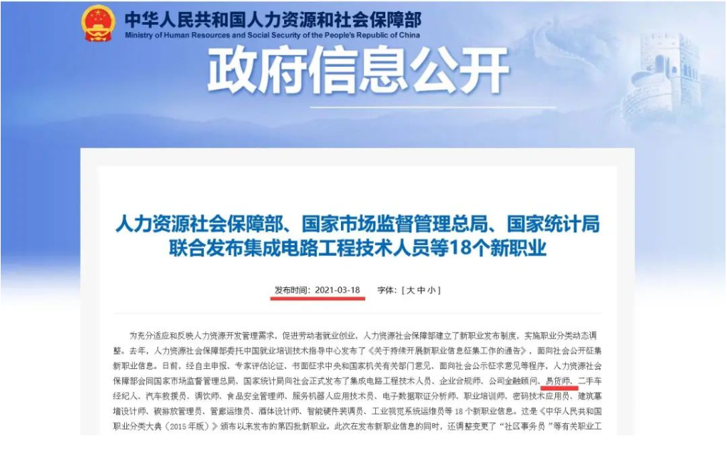 易货师新职业的由来 —— 写在易货师新职业发布一周年2021年3月18日,人力资源社会保障部、国家市场监督管理总局、国家统计局联合发布了《中华人民共和国职业分类大典(2015年版)》颁布以来的第四批新职业。其中,易货师正式列入国家批准的新职业。易货师新职业的发布,凝聚了几代易货人的付出与期盼,离不开广大从业者的努力和奋斗,对于促进就业创业、加强职业培训、规范行业秩序、推动产业发展等具有重要意义。从默默无闻到官方认可,在易货师新职业发布一周年之际,中国商业联合会易货贸易分会向每位易货人致敬,让我们一同回顾易货师新职业走过的历程,展望新职业蕴含的发展新机遇。